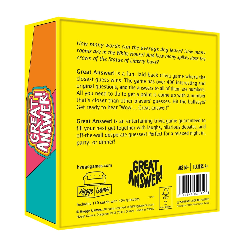 How many words can the average dog learn? How many rooms are in the White House? And how many spikes are on the Statue of Liberty’s crown? In Great Answer!, every question has a numerical answer—so all you have to do is guess the closest number!