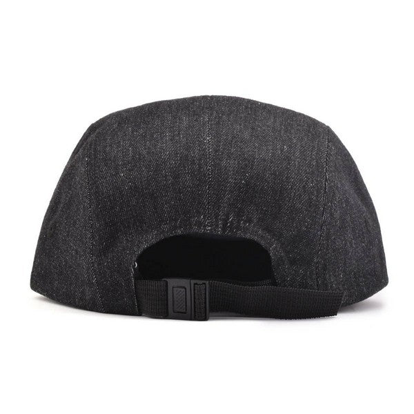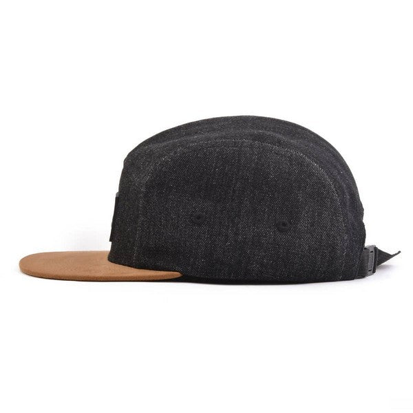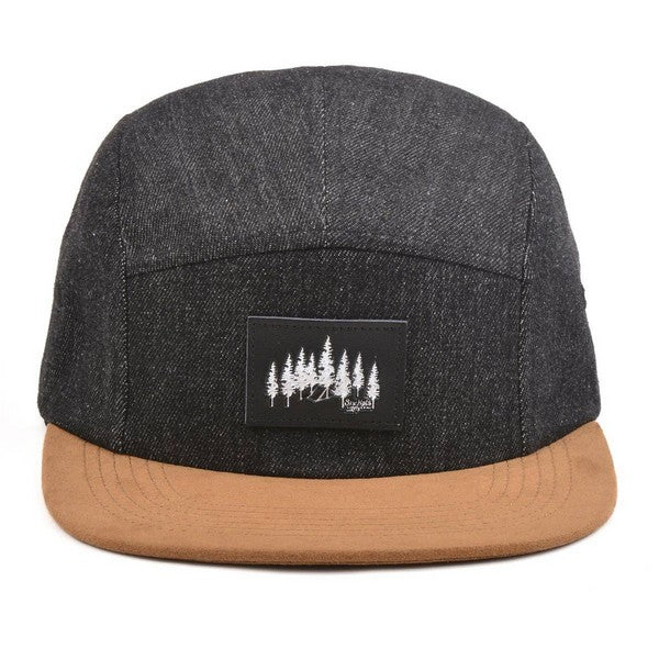 The explorer snapback is for the wanderers who focus on the journey, not the destination. This black denim cap with light brown suede brim features a hand drawn tent & trees on a black leather patch and a buckle enclosure.