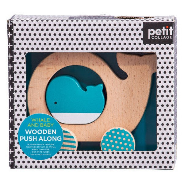 Your little one will love taking this sweet whale toy for a spin! This Whale and Baby Wooden Push Along Toy from Petit Collage has smooth wheels and simple easy to grasp shapes to encourage little ones to push this happy animal along.