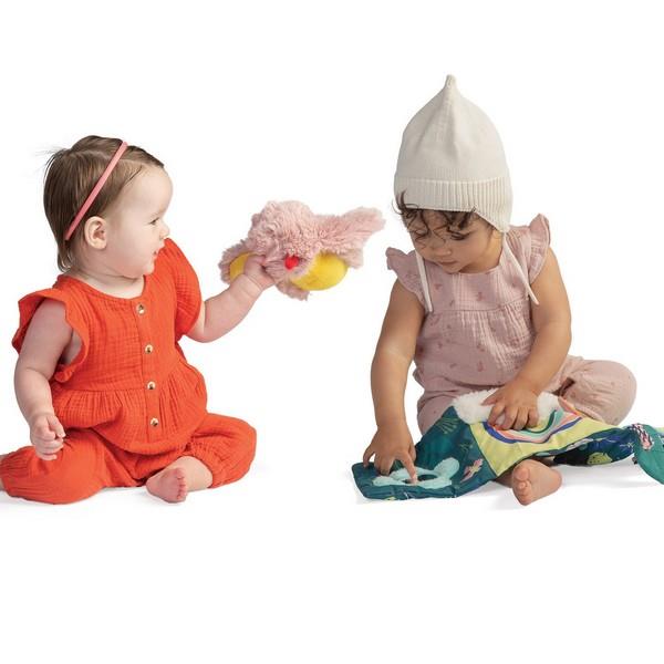 This soft plush bird features crinkle paper wings and chirps with movement. Remove tab on back to activate chirping.