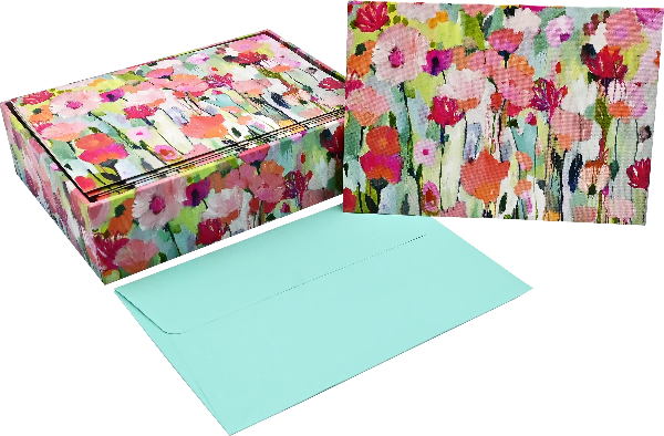 Brighten their day with a personal note and a springtime palette of fresh florals! This vibrant notecard set's Impressionistic design depicts a field of vibrant spring flowers.