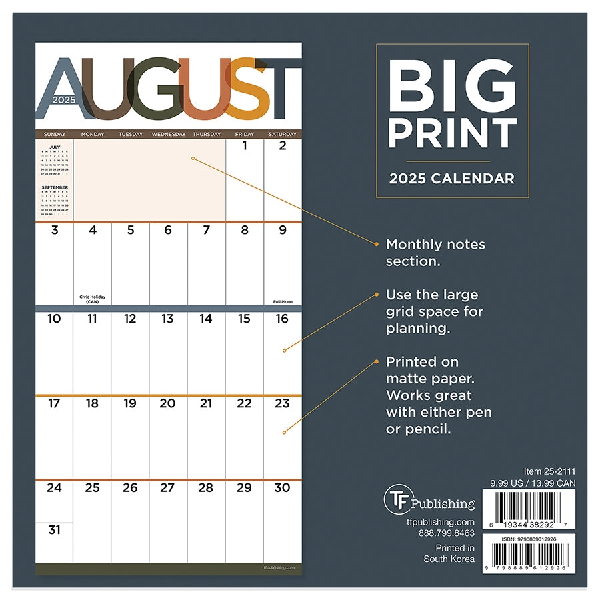 Small but mighty! This 2025 Big Print mini wall calendar is now paired with the big grid planning design! Not only do you get very large dates and easy to read holidays in bold print, but the monthly planning grid spans two pages, measuring 14" (h) x 7" (w) when open. The daily grid space is rectangular and vertically-oriented for all of your appointments and daily tasks to help keep you organized.