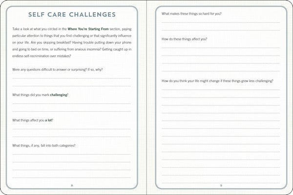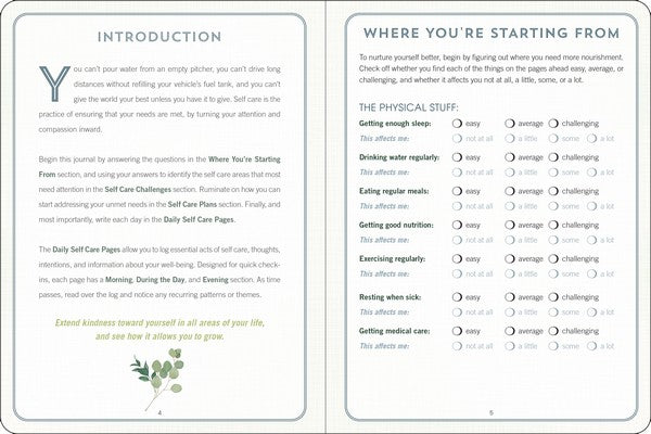 • Contents include: Introduction, Where You're Starting From (The Physical Stuff, the Mental Stuff, the Interpersonal Stuff), Self-Care Challenges, Self-Care Plans, and Daily Self-Care Pages.
